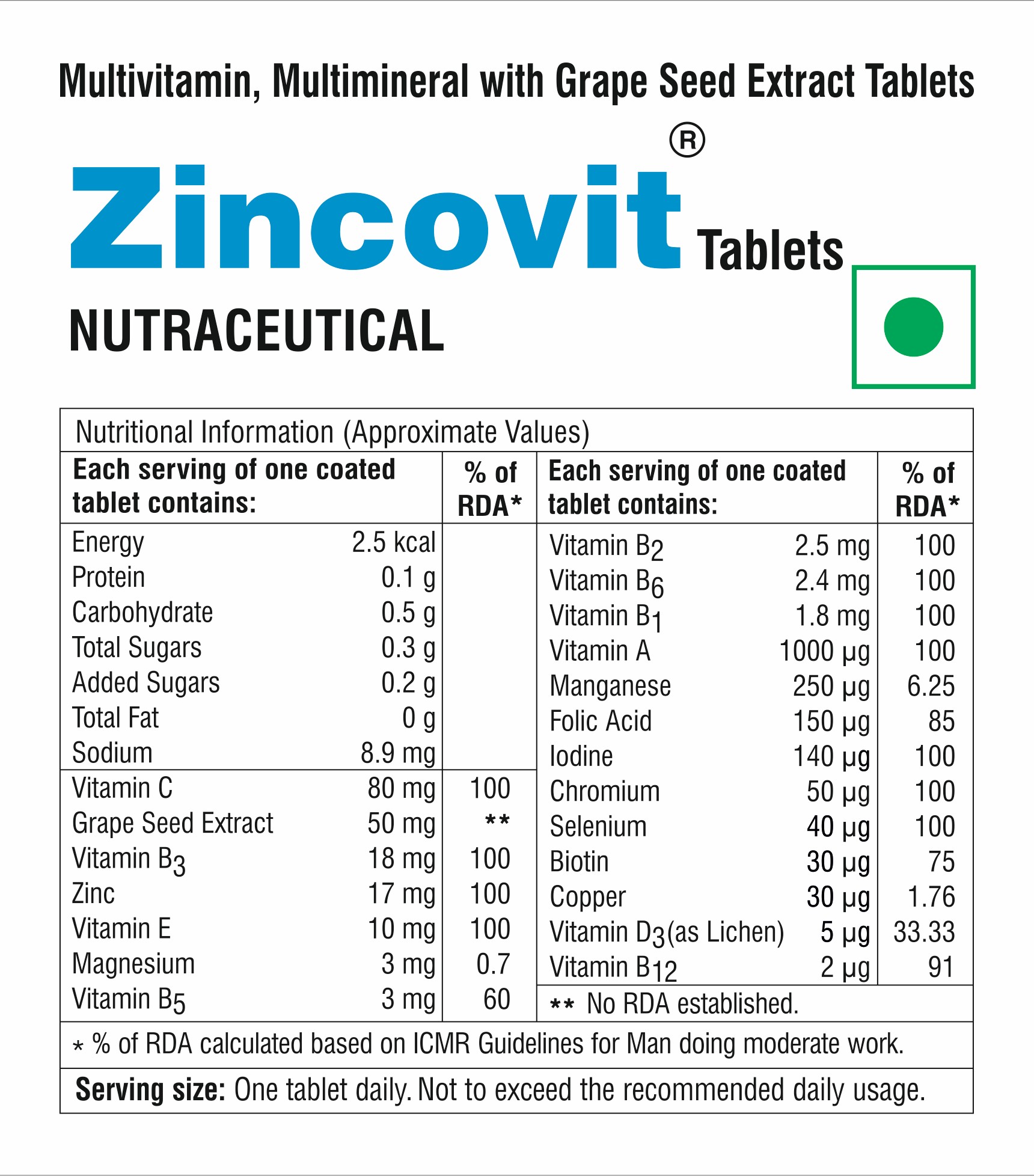 Key Ingredients: Vitamin B2, Vitamin B6, Vitamin B1, Vitamin A, Manganese, Folic Acid, lodine, Chromium, Selenium, Biotin, Copper, Vitamin D3(as Lichen), Vitamin B12, Vitamin C, Grape Seed Extract, Vitamin B3, Zinc, Vitamin E, Magnesium, Vitamin B5, Sugar, Carriers (170(1), 460(1)), Vitamins, Glazing agents (553(iii), 462, 901, 903), Lactose, Grape Seed Extract, Disintegrant (466), Polacrilin Potassium, Minerals, Starch, Binding agents (1208, 1201), Diluent (341(ii)), Colours (171, 124), Lubricant (470(1)). Methacrylic Acid Copolymer, Cellulose acetate phthalate, Thickener (414) & Preservative (219)